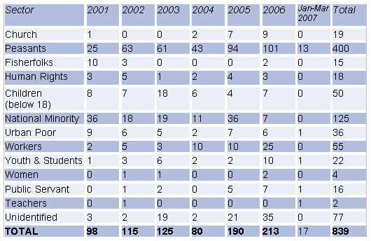 An impressive amount of cases of extra-judicial killings, disappearances and torture, often in combination with each other, have been documented before the tribunal by oral testimonies by survivors, witnesses and experts who provided also the opportunity of more in depth questioning by the jury. Further for each of the cases (listed in Annex 2) a very detailed account, including copies of original documents and certificates has been available for the jury. The synoptic presentation of the 839 cases of extra-judicial killings in a table, allows on one side the detailed view of the increasing number of cases from the 98 in 2001 to the 213 in 2006, on the other side makes visible the composition of this ‘population’ which is truly and fully representative of the targeted killing strategy: persons associated with ‘ left’ organisations, church people, community leaders, peasants, journalists, lawyers, people of the so-called party list organisations (parliamentary opposition), human rights activists or simply witnesses of extra-judicial killings.